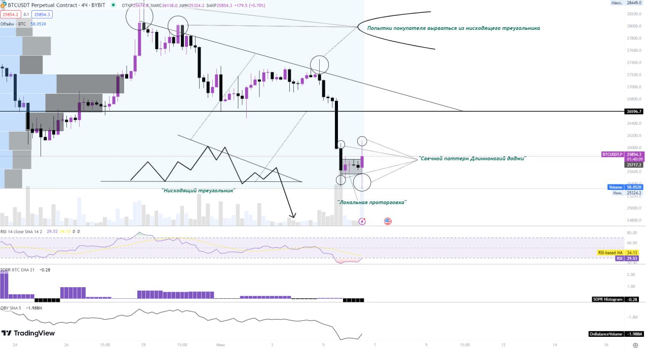 По индикатору SOPR видно, что большинство инвесторов продаёт свои активы в убыток, так как индикатор находится на значениях меньше 1, что указывает на то, что большинство трейдеров и инвесторов находится в минусе. Я ожидаю продолжение давления на первую криптовалюту мира, что подтверждает формирование свечного паттерна длинноногий Доджи.