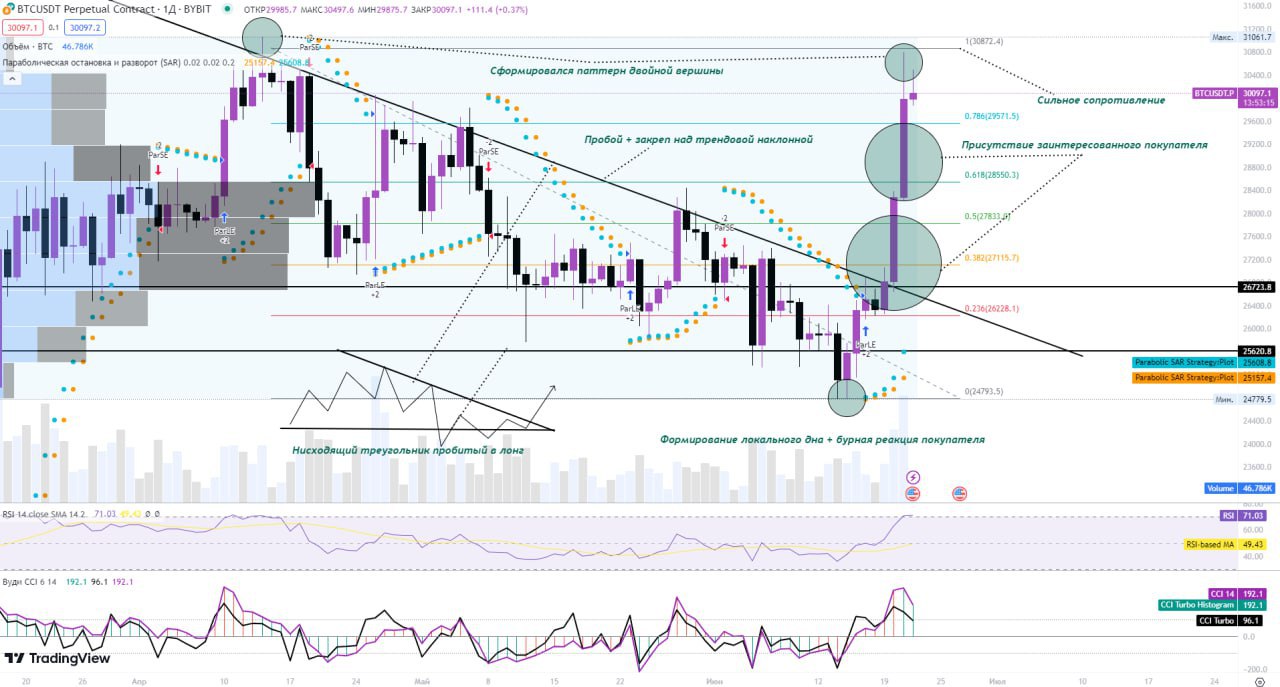 Друзья, добрый день. По BTC мы увидели пробой нисходящего треугольника в шорт, триггером для этого выступил SEC, который подал в суд на криптовалютную биржу Binance. На данный момент BTC полностью зависим от судебных разбирательств и заявлений публичный людей. Буквально час назад стало известно, что SEC так же подаёт в суд на криптовлаютную биржу Coinbase и признаёт ряд активов ценными бумагами.