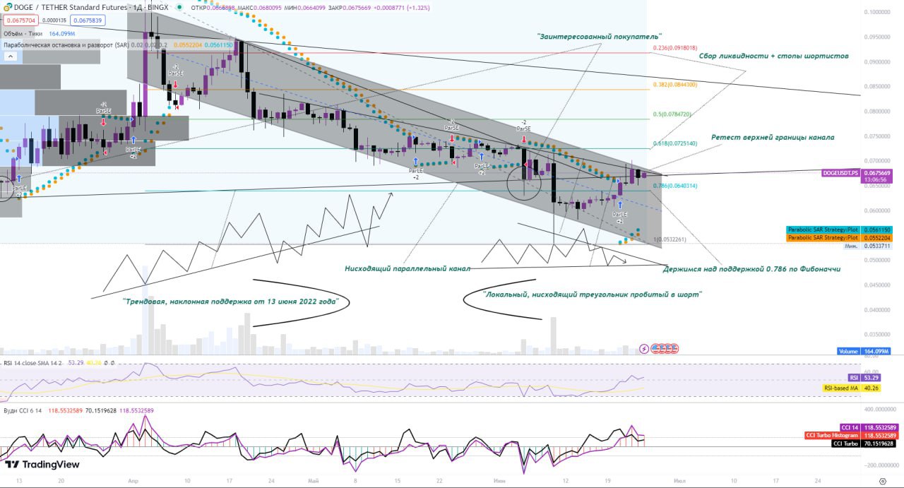 Друзья, добрый вечер, по результатам опроса вы хотели, чтобы я опубликовал аналитику по #DOGE. Монета пришла к трендовой, наклонной поддержке, тянущейся от 13 июня 2022 года, которая является важнейшей поддержкой, если продавцы смогут увести актив ниже — нас ждёт долгая и болезненная коррекция актива. В монете есть сильный покупатель, который выкупает всю ликвидность продавцов и всячески удерживает монету выше отметки 0.6629$.