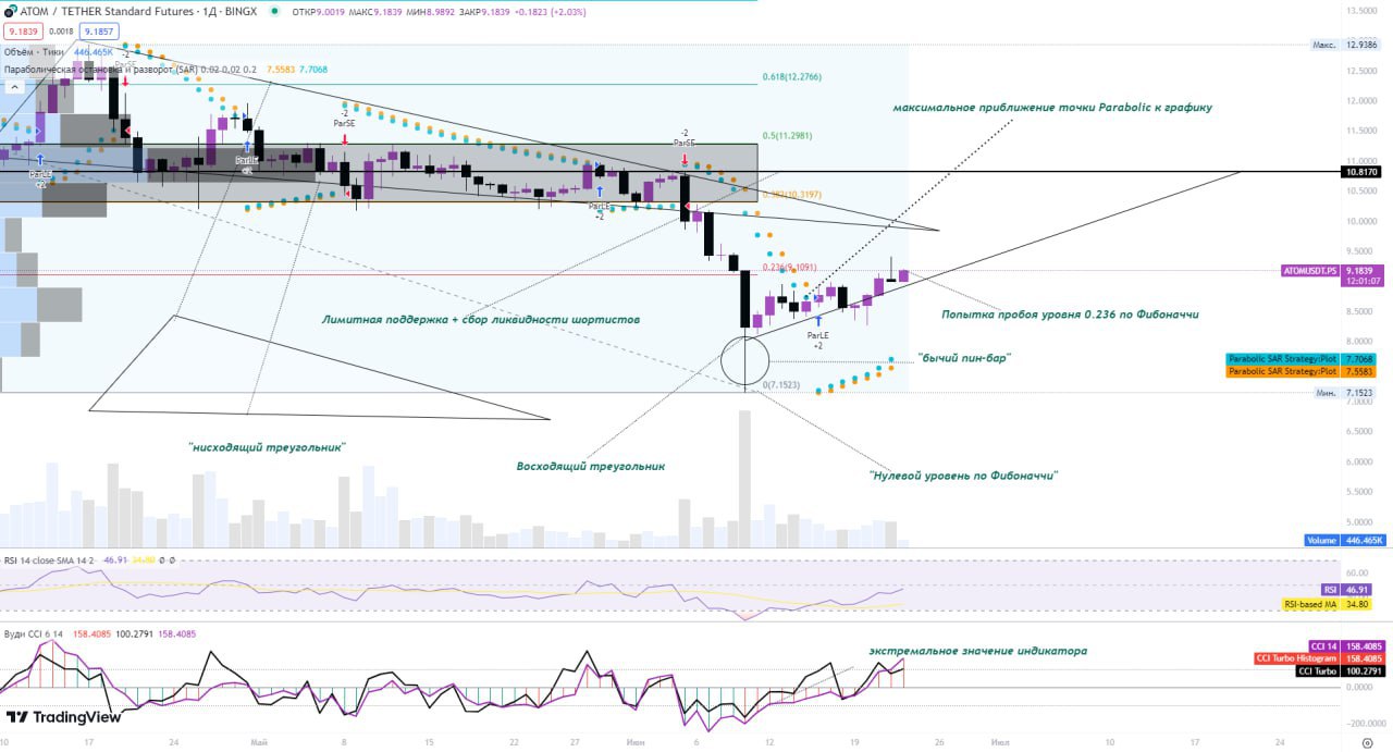 Друзья, добрый вечер, по результатам опроса вы хотели, чтобы я опубликовал аналитику по #ATOM. Актив планомерно снижался в рамках нисходящего треугольника и на отметке 10.136$ пробил его в шорт. Ниже данной отметки находились стопы лонгистов, которые спровоцировали дальнейшее падение актива в зону 7.14$ (+ монета подвержена корреляции с BTC и в точности повторяла его движение).
