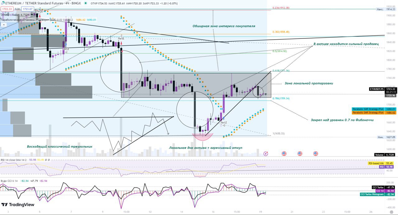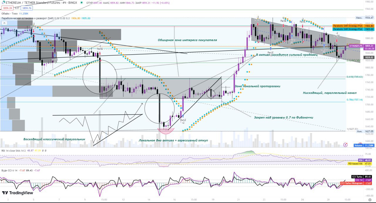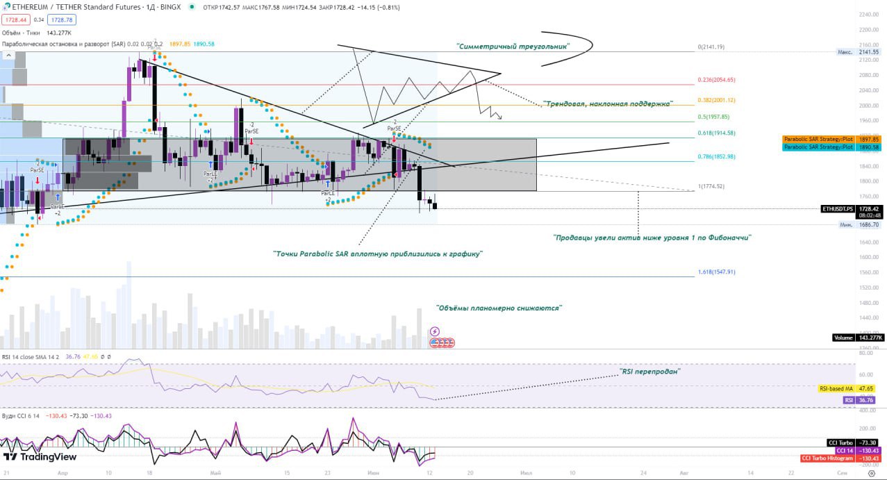 Уже в этом году состоится новое обновление ETH под названием Dencun, которое призвано внести сильные изменения в блокчейн, а в частности - снизить комиссии. Продавцы смогли увести актив ниже отметки 1 по Фибоначчи, которая являлась важной поддержкой, поэтому допускаю снижение актива вплоть до 1.618 по Фибоначчи (1550$). Так же, обратите внимание на то, что точки индикатора Parabolic SAR вплотную приближаются к графику и если мы не увидим сильной реакции продавцов, то можно будет рассматривать локальный рост актива в зону интереса покупателей 1750$ - 1920$.