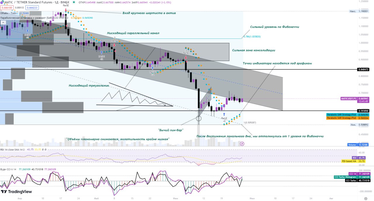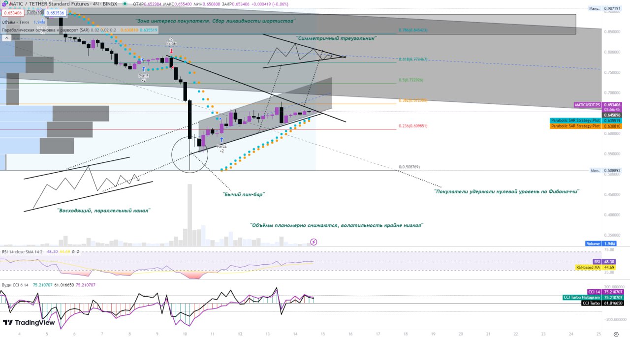 Покупателям удалось остановить падение на 0 линии Фибоначчи и увести выше 0.236 по Фибоначчи, в симметричный треугольник. Однако, мы всё так же находимся в нисходящем тренде (Тому подтверждение глобальный, нисходящий, параллельный канал и нисходящий треугольник). Для продолжения роста нам необходимо пробить симметричный треугольник в лонг, и попытаться вернутся в нисходящий канал. Не забывайте следить за новостным фоном и событиями вокруг SEC и MATIC, которые могут сломать любой тех анализ.