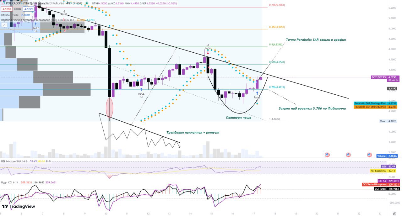 Друзья, добрый день. По результатам опроса вы хотели, чтобы я опубликовал аналитику по #DOT. Обратимся к графику. Монета планомерно приступает к развороту тренда (По крайней мере покупатели предпринимают попытки). Сформирован паттерн чаша, который может привести нас к пробою трендовой наклонной (За которой собрана большая ликвидность шортистов). Мы смогли закрепится над уровнем 0.786 по Фибоначчи, что открывает дорогу монете дальше, однако, мы не можем пробить трендовую наклонную, что намекает на скорый откат (Если у покупателя не хватит сил пробить её).