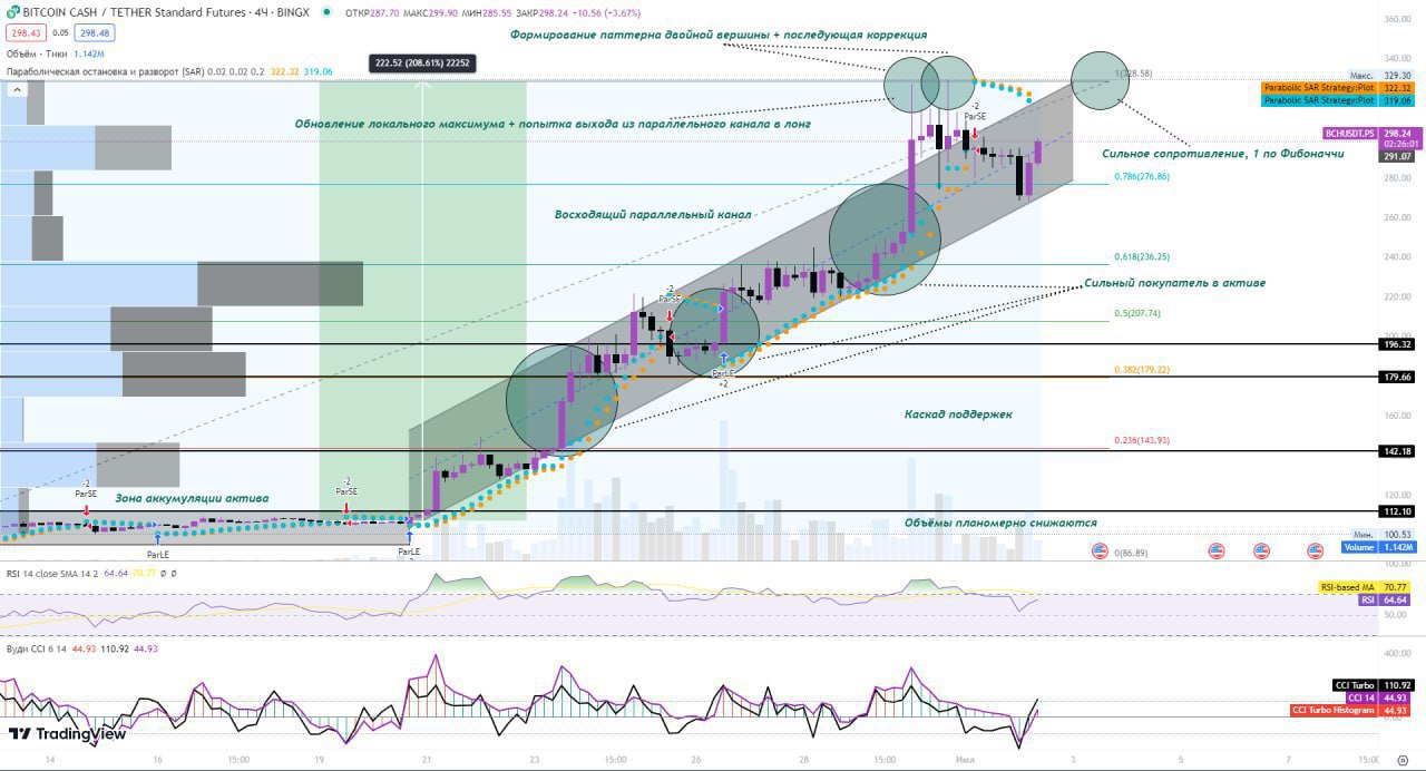 Друзья, добрый день. По результатам реакция вы хотели, чтобы я опубликовал аналитику по #BCH. Обратимся к графику. BCH - Bitcoin Cash — криптовалюта, форк биткойна, отделившийся от него. Думаю, многие из вас видели сильный памп данного актива, что является нонсенсом для альткоинов в текущей рыночной ситуации. Все связано это с тем, что SEC начал признавать целый ряд топовых криптопроектов ценными бумагами. #BCH ценной бумагой SEC не признает, так как это форк BTC.